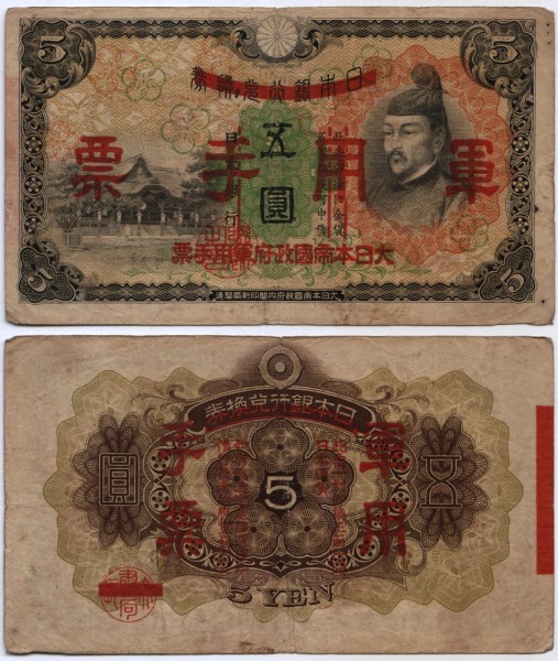 банкнота Китай (Японская оккупация) 5 йен 1938 год тип 2 Состояние: F Размер: 132 х 74 мм.